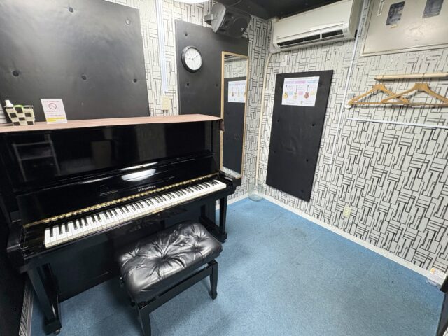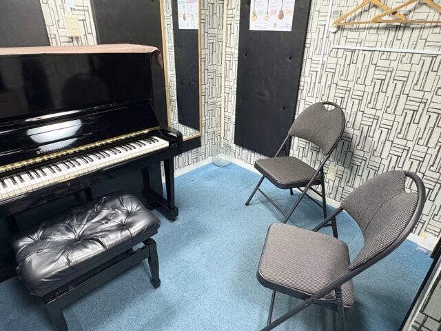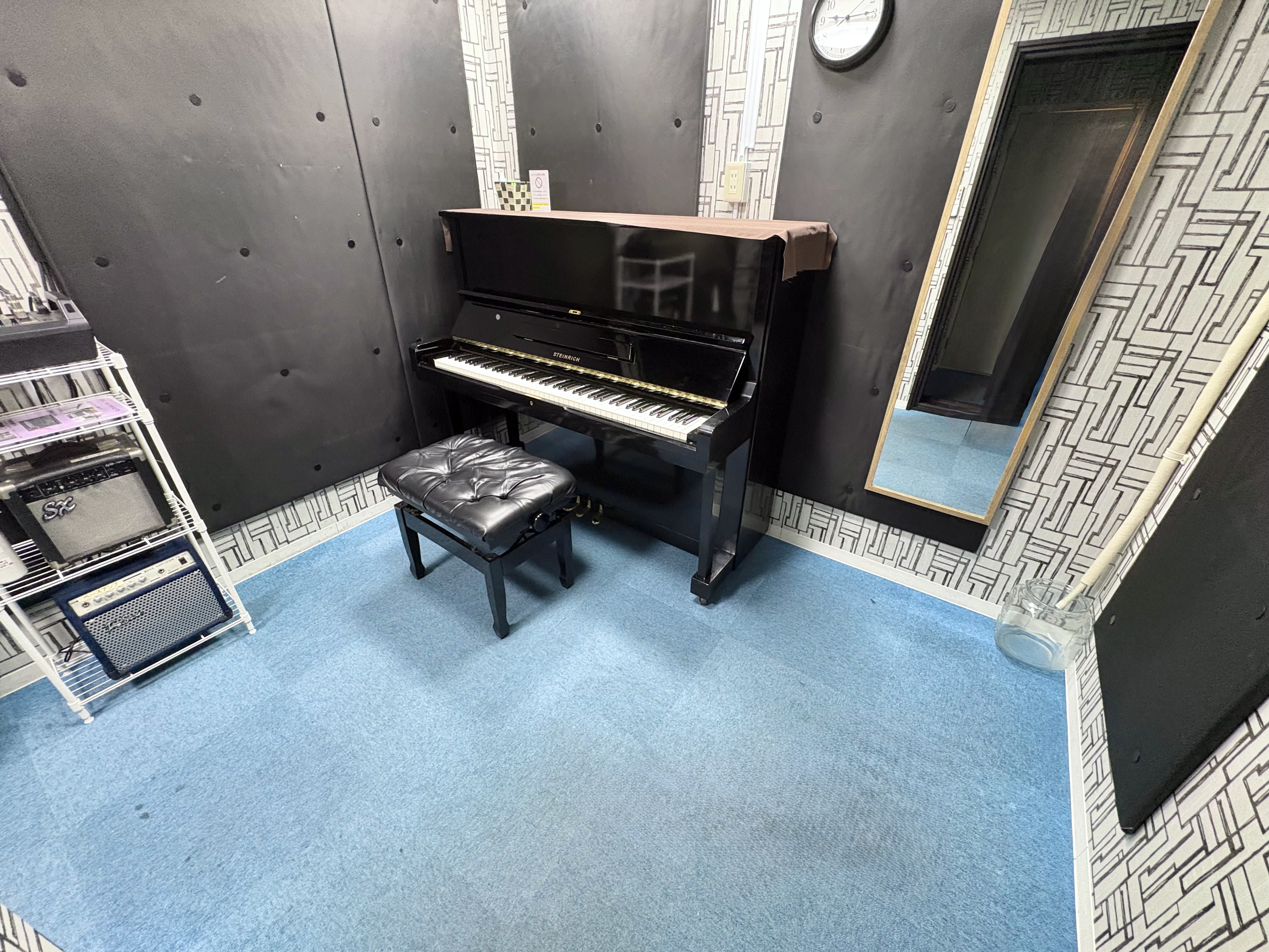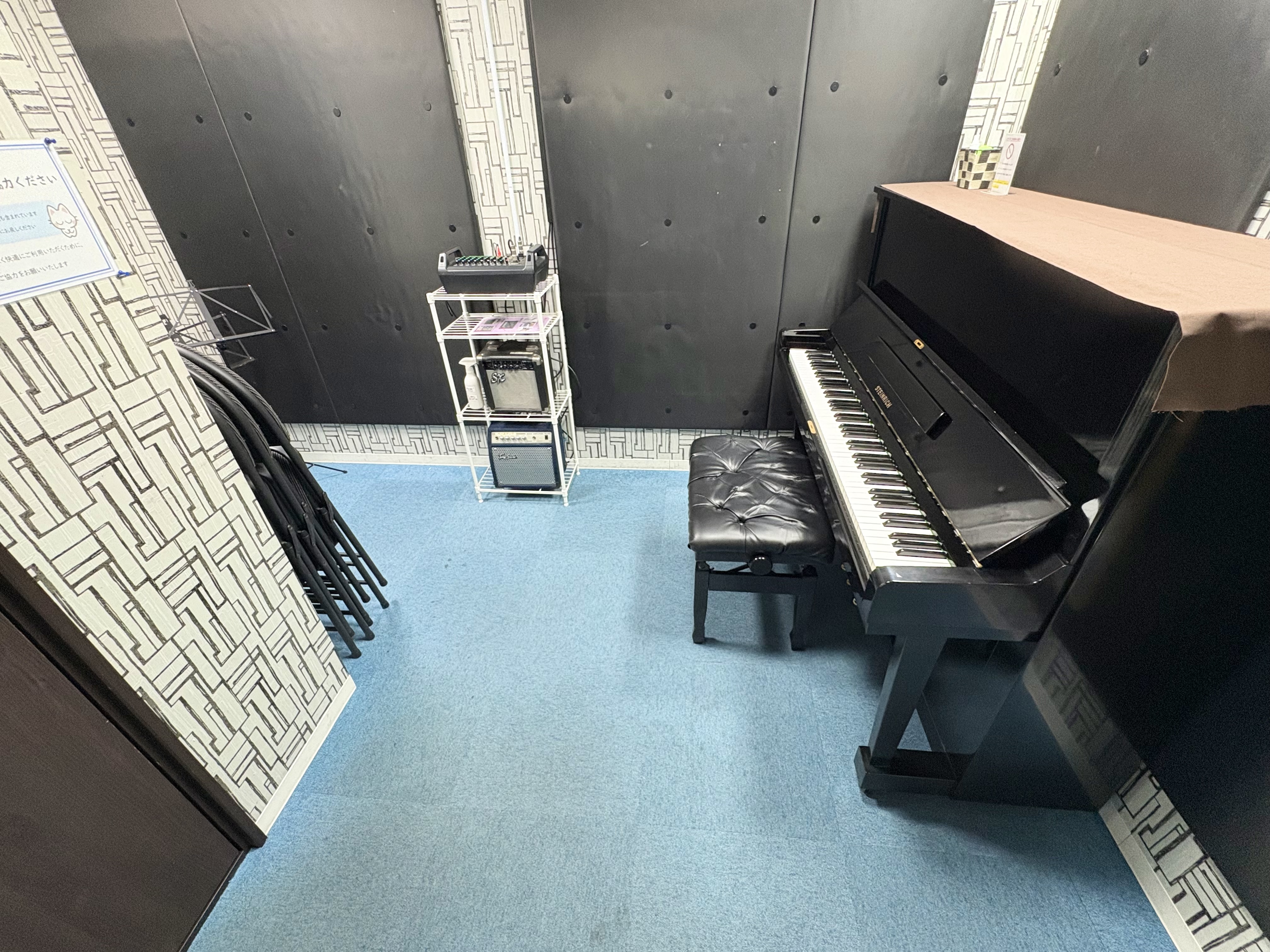 広さ約5畳のスタジオで、設置したピアノ横のスペースを広く取っており、ピアノ奏者を加えて最大5名程度での音合わせにも利用できます。