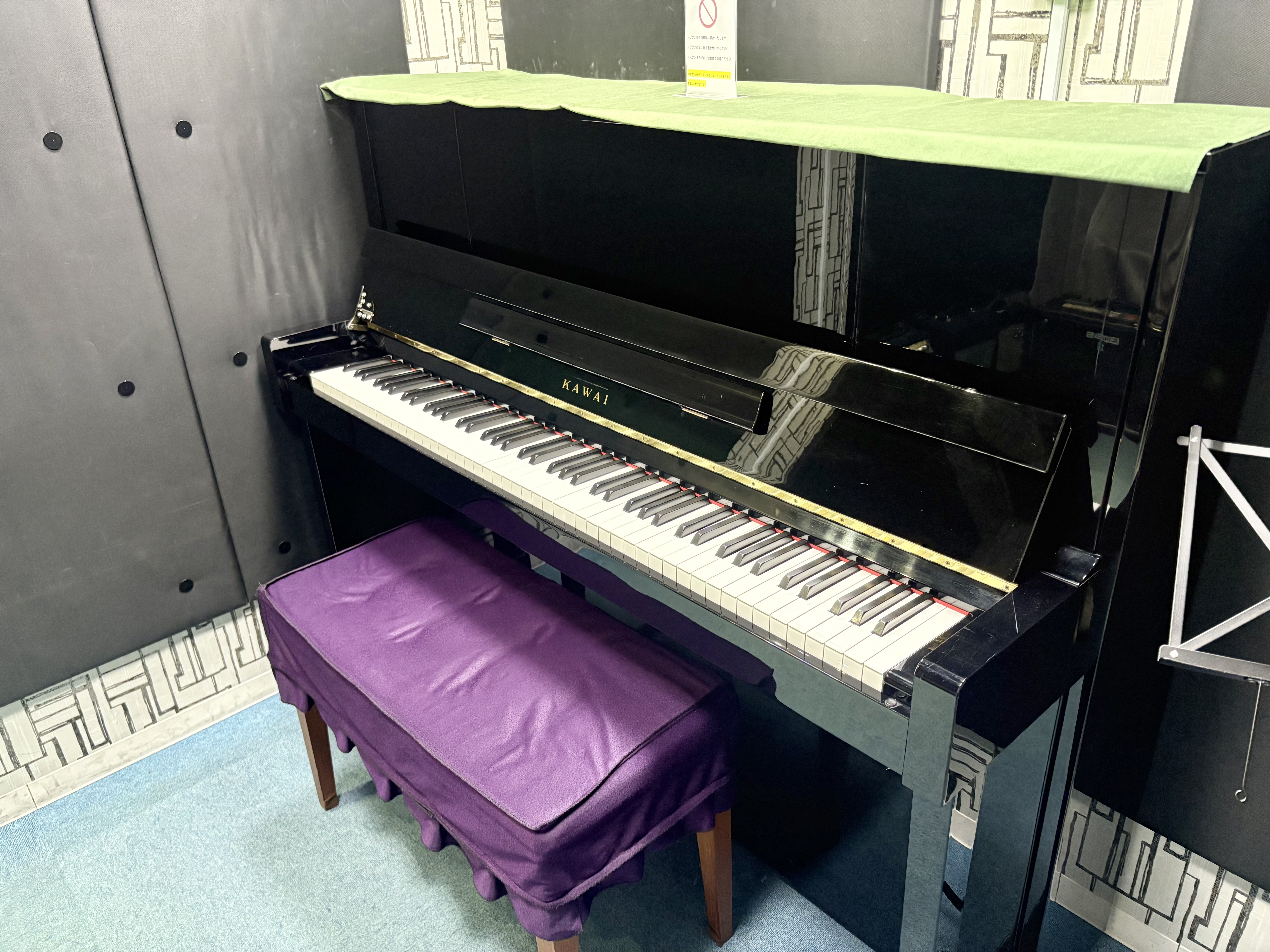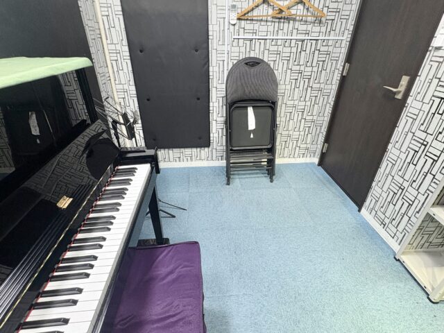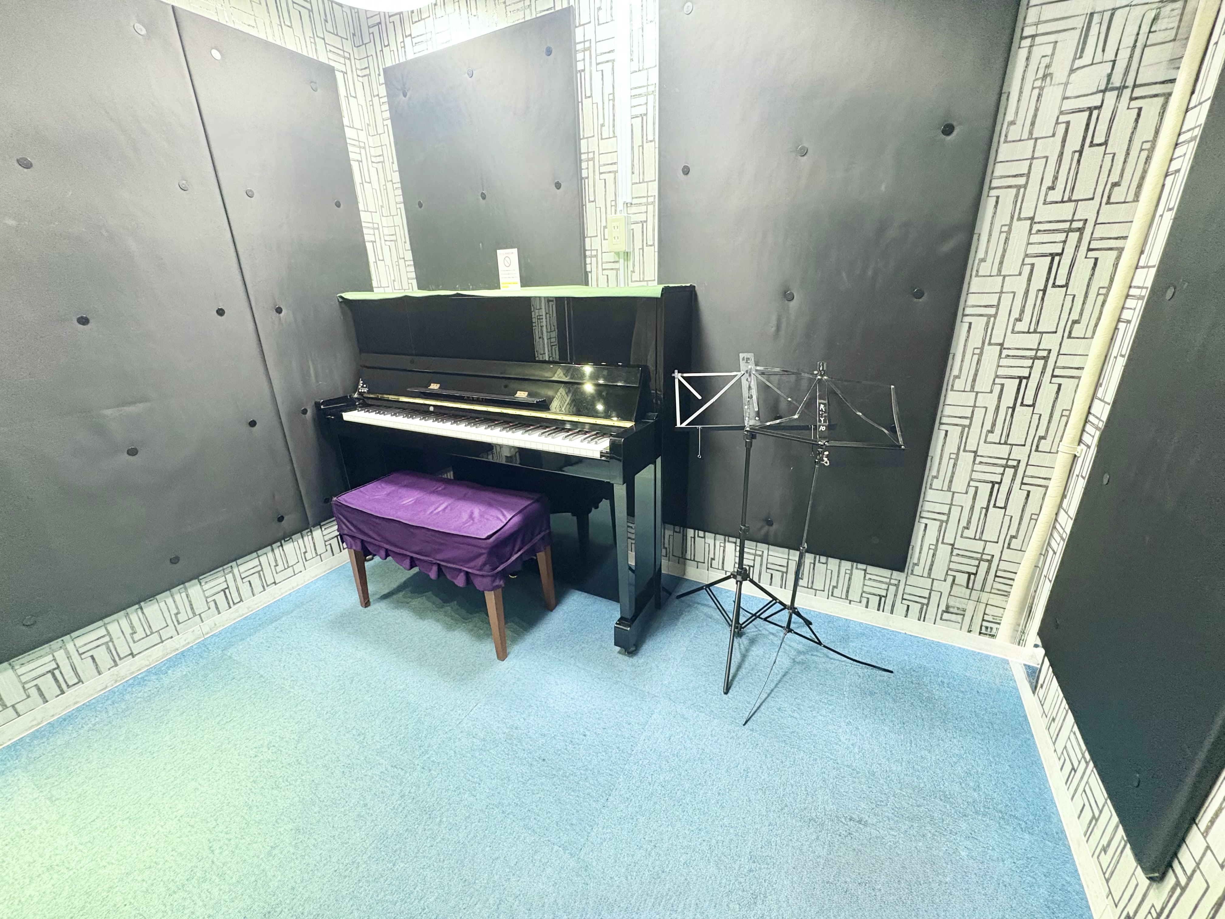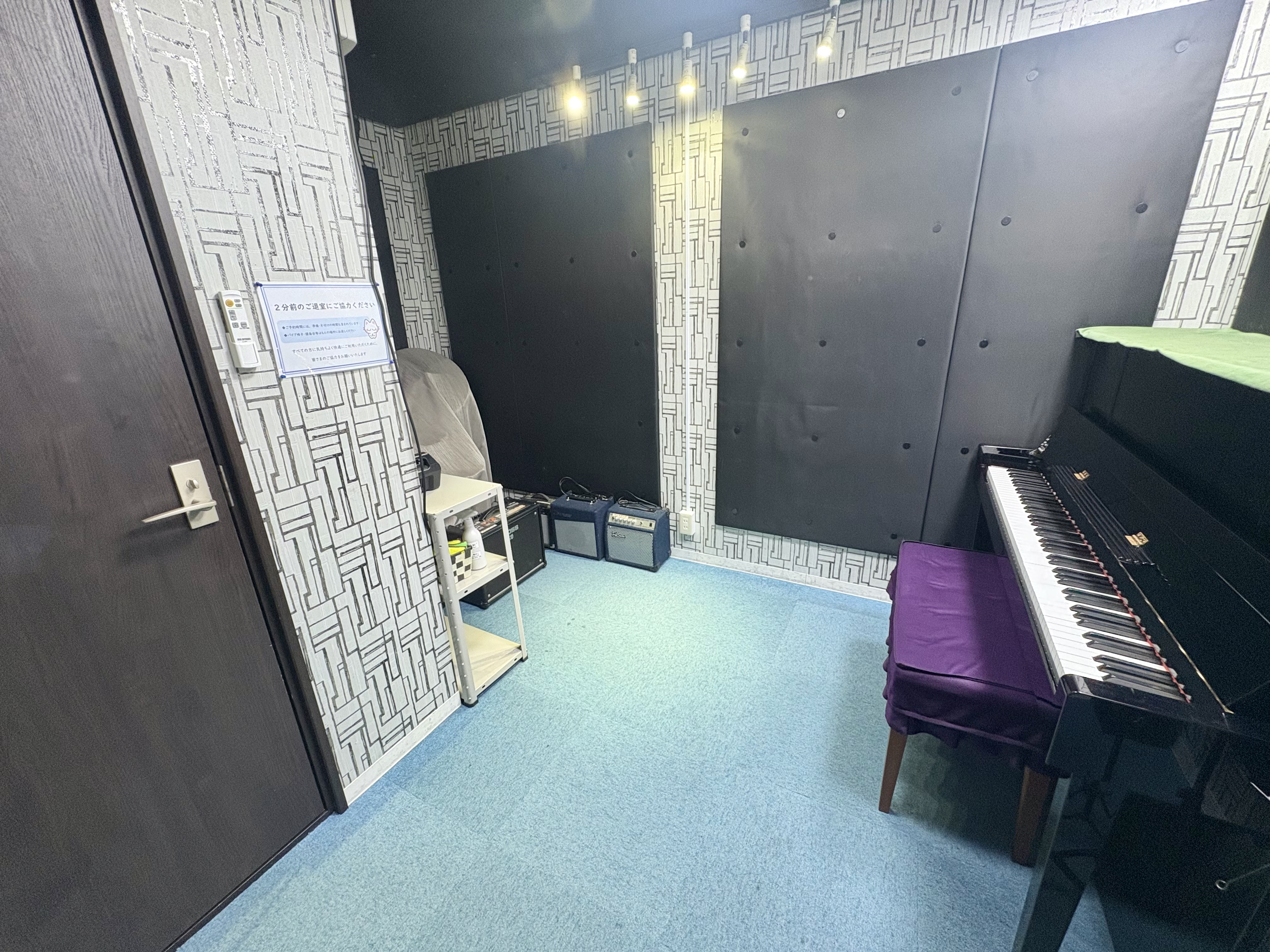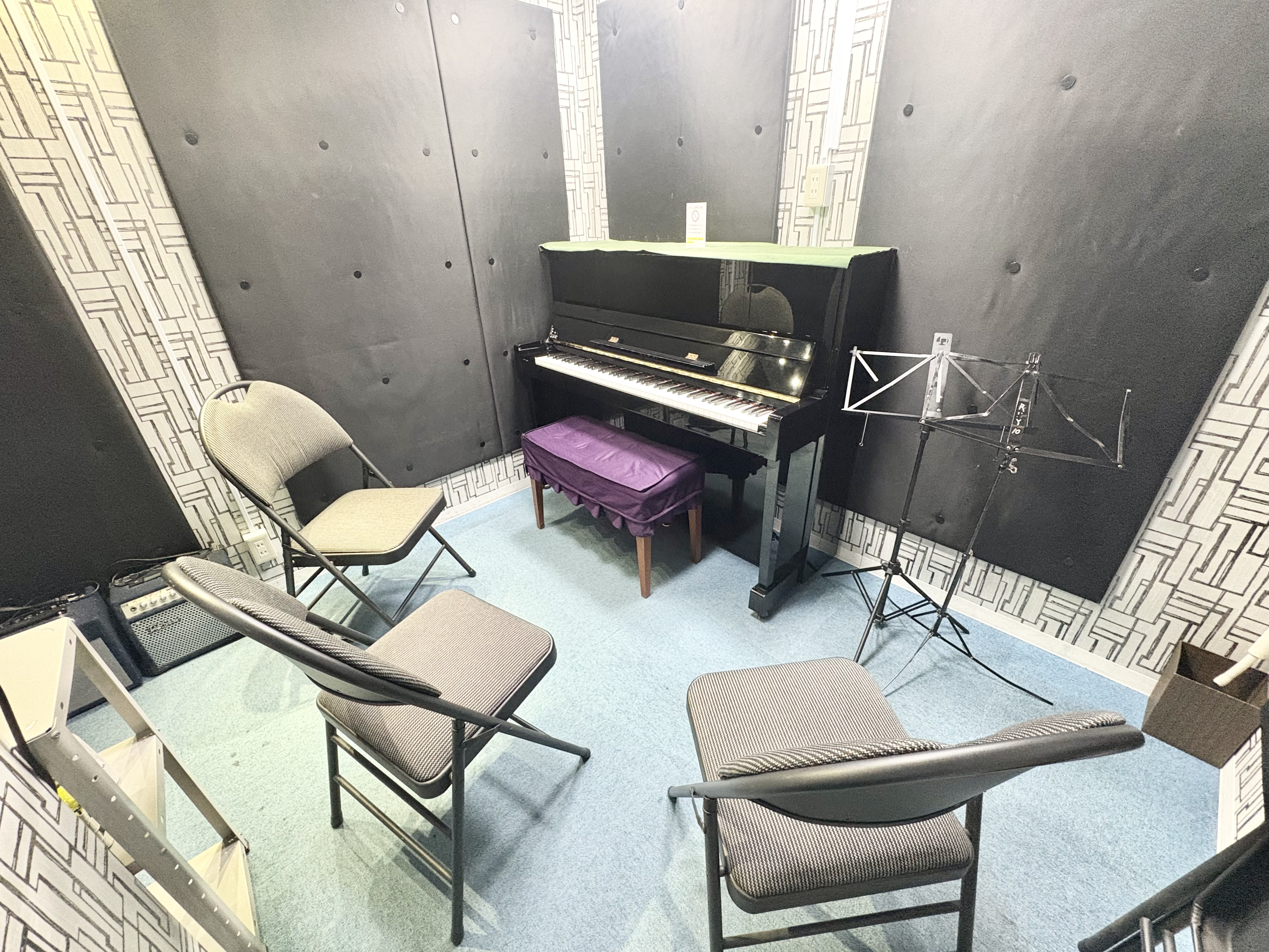 広さ約4畳のスタジオで、設置したピアノ横のスペースを広く取っており、ピアノ奏者を加えて最大4名程度での音合わせにも利用できます。