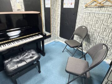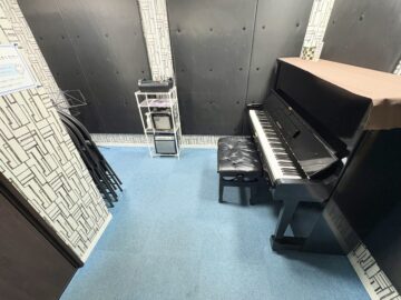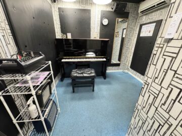 広さ約4畳のスタジオで、設置したピアノ横のスペースを広く取っており、ピアノ奏者を加えて最大4名程度での音合わせにも利用できます。