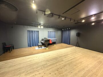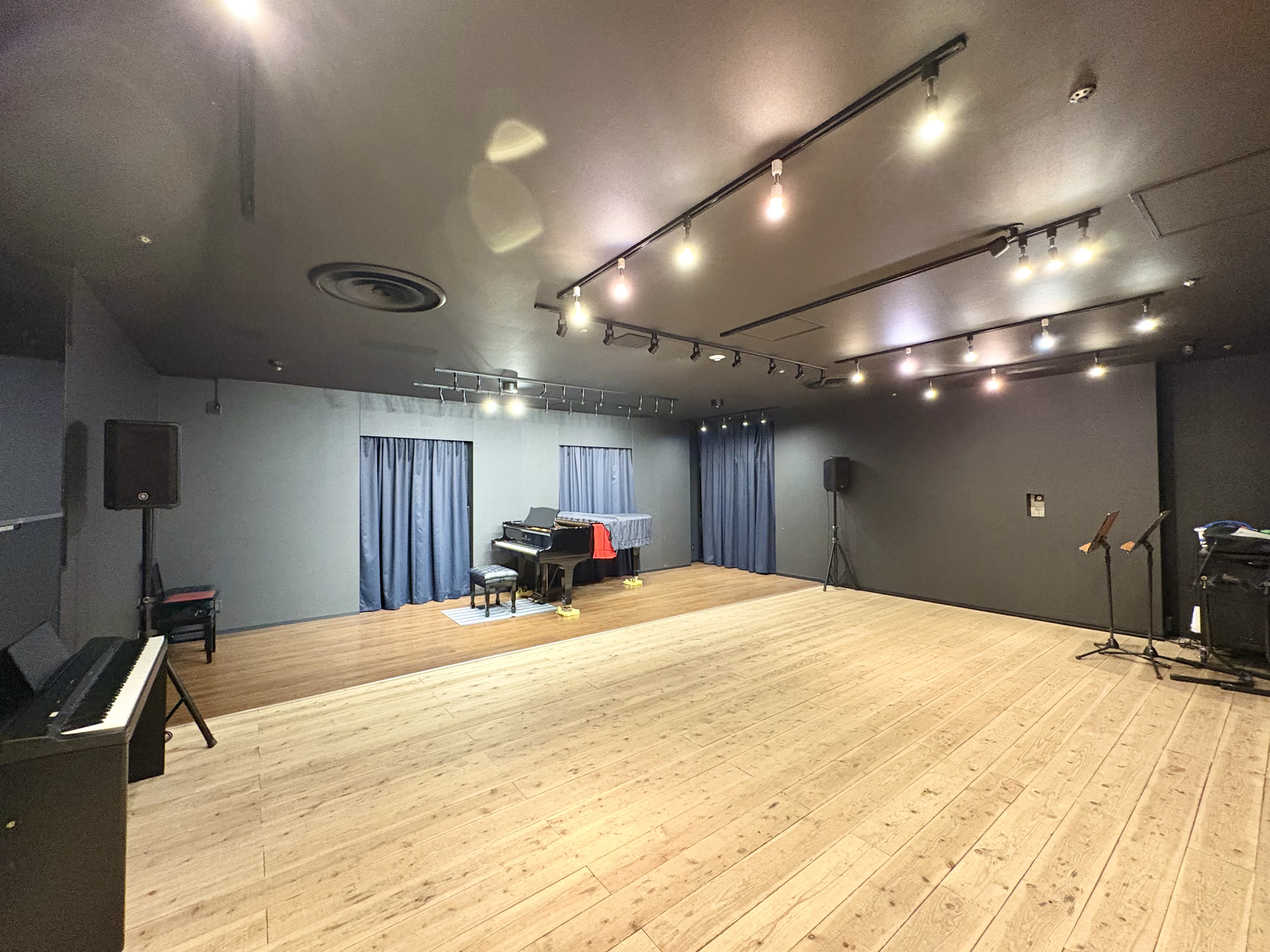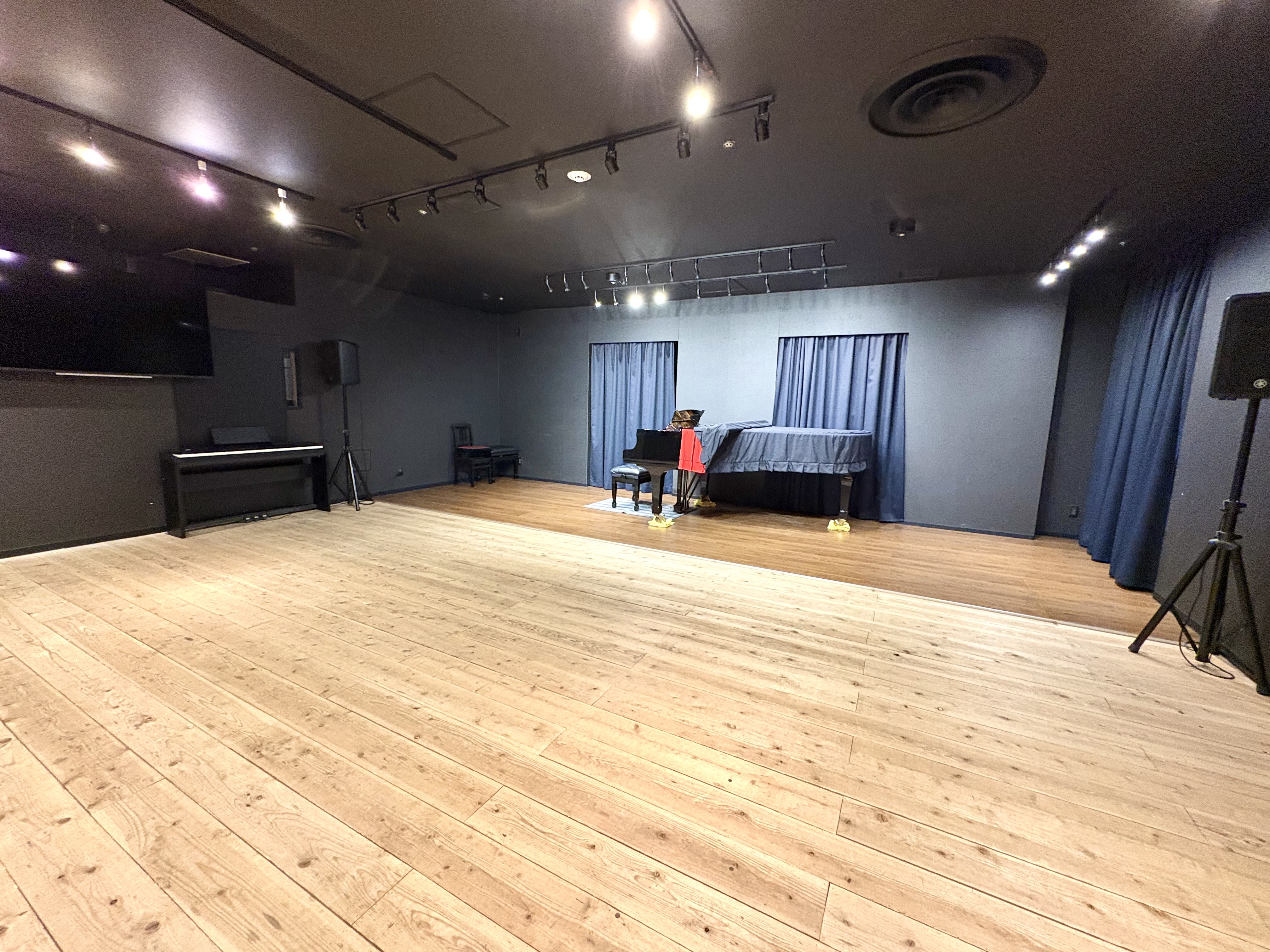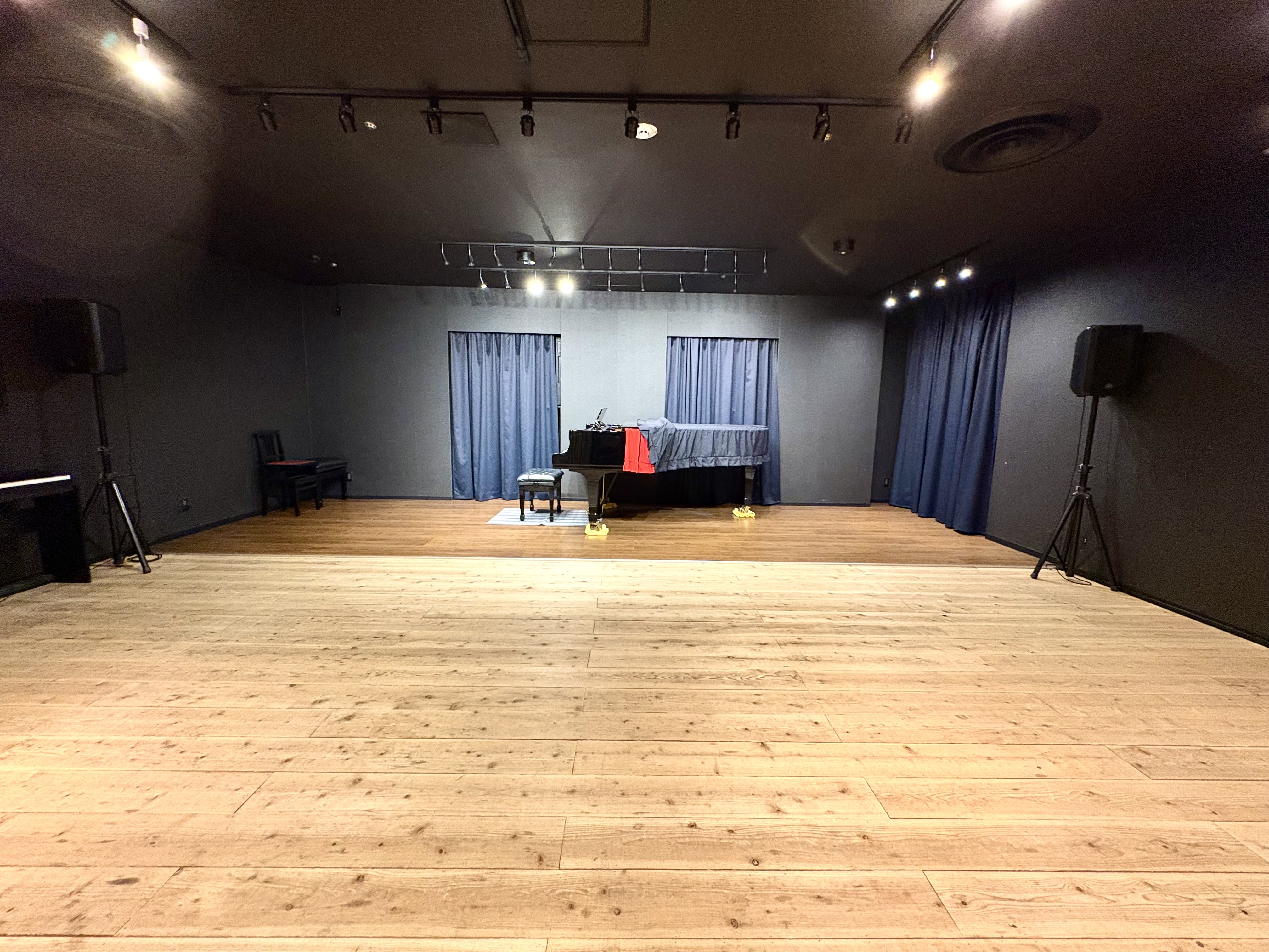 高さ数センチほどのステージを設置、床は音の響きを重視した白木のフローリング、照明はスポットライト(ステージ照明に近い状態)を取り付けているので、